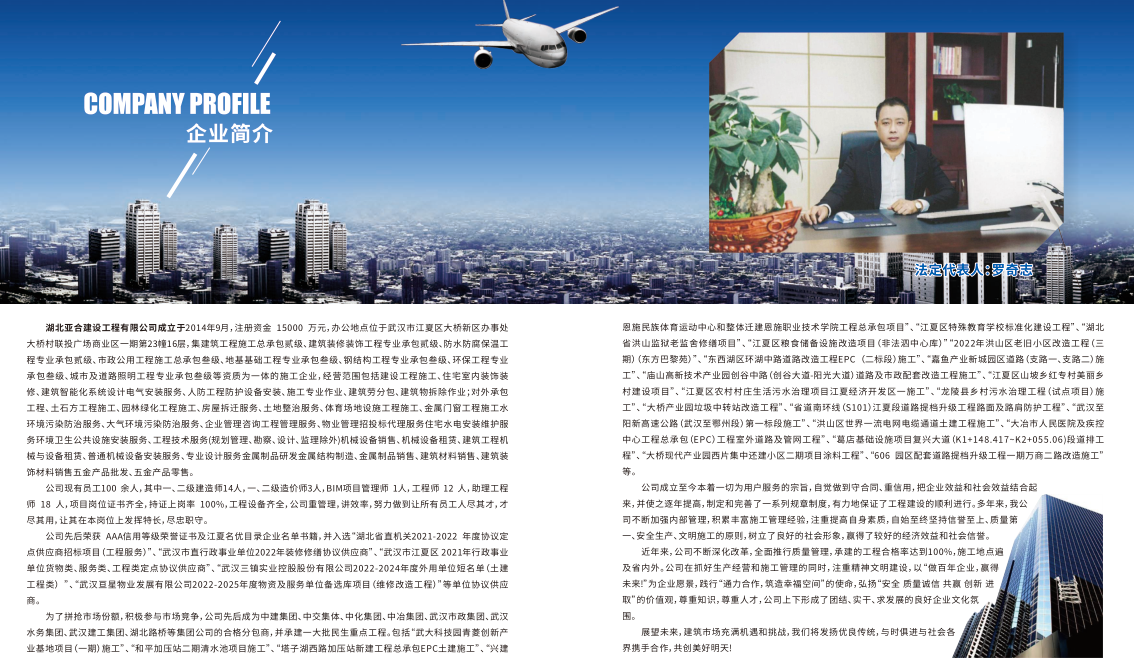 湖北亞合建設(shè)工程有限公司成立于2014年9月,注冊資金15000萬元,辦公地點(diǎn)位于武漢市江夏區(qū)大橋新區(qū)辦事處大橋村聯(lián)投廣場商業(yè)區(qū)一期第23幢16層,集建筑工程施工總承包貳級(jí)、建筑裝修裝飾工程專業(yè)承包貳級(jí)、防水防腐保溫工程專業(yè)承包貳級(jí)、市政公用工程施工總承包叁級(jí)、地基基礎(chǔ)工程專業(yè)承包叁級(jí)、鋼結(jié)構(gòu)工程專業(yè)承包叁級(jí)、環(huán)保工程專業(yè)承包叁級(jí)、城市及道路照明工程專業(yè)承包叁級(jí)、施工勞務(wù)資質(zhì)等資質(zhì)為一體的施工企業(yè)。