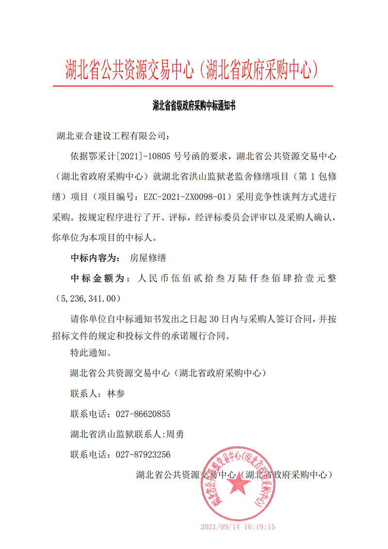 熱烈祝賀湖北亞合建設(shè)工程有限公司在《湖北省洪山監(jiān)獄老監(jiān)舍修繕項(xiàng)目》中標(biāo)!
